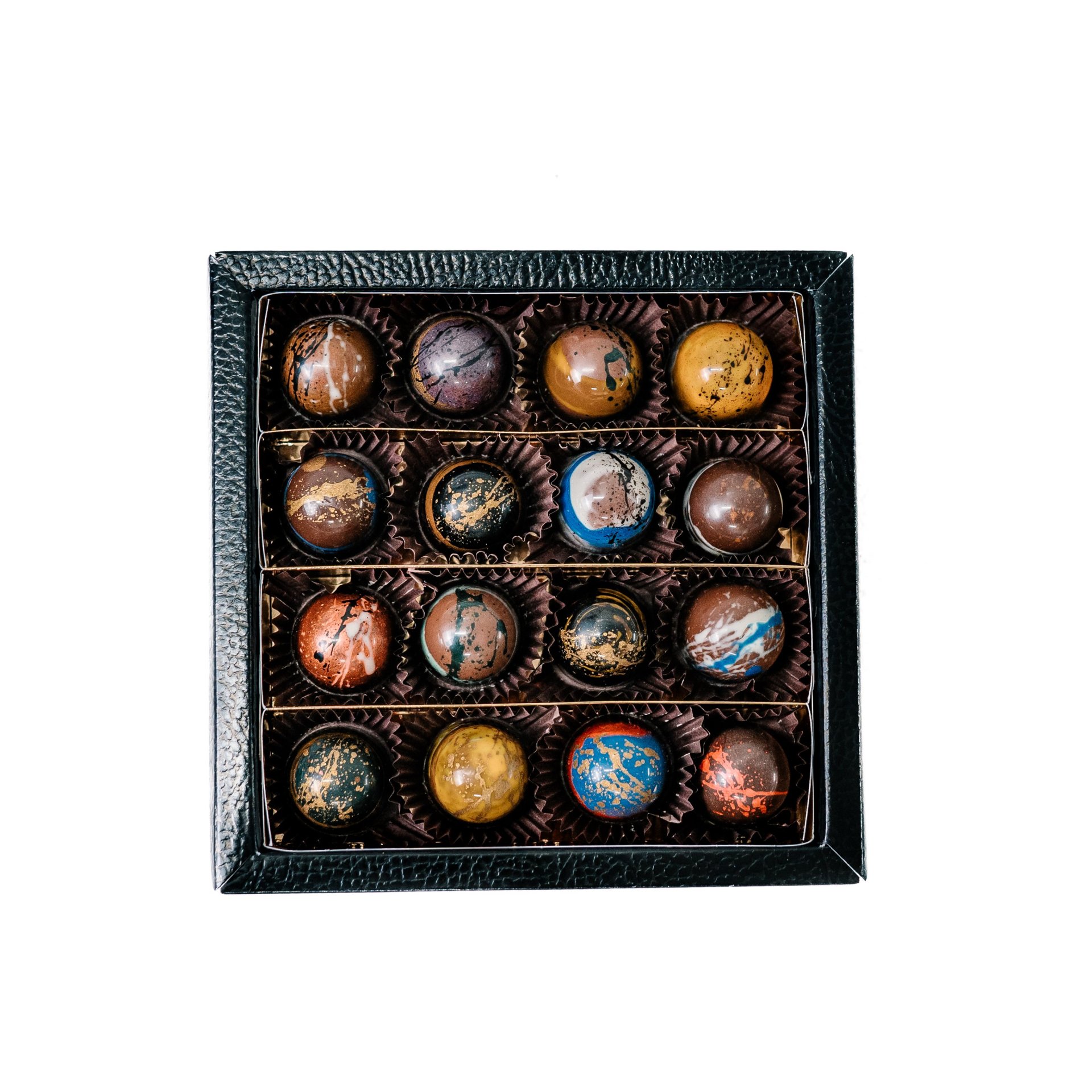 V hořké čokoládě: perníková, s mátovým likérem, mandlová s likérem Amaretto, s Absinthem St. Antoine, s pomerančovým likérem Grand Marnier, višňová s višňovkou od Žufánka, světlý nugát a slaný karamel.