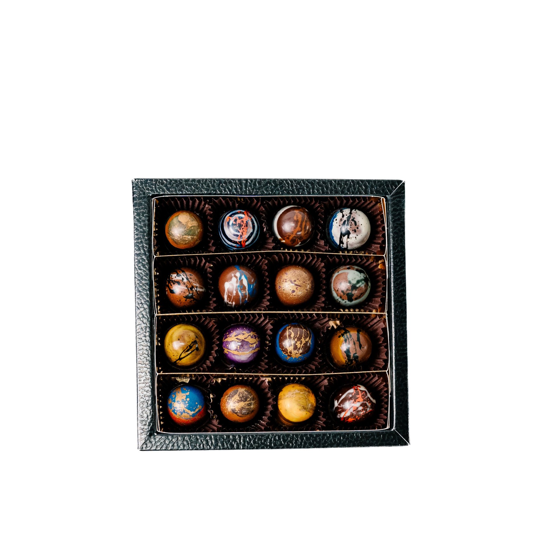 Výběr čokoládových pralinek z hořké a mléčné čokolády.