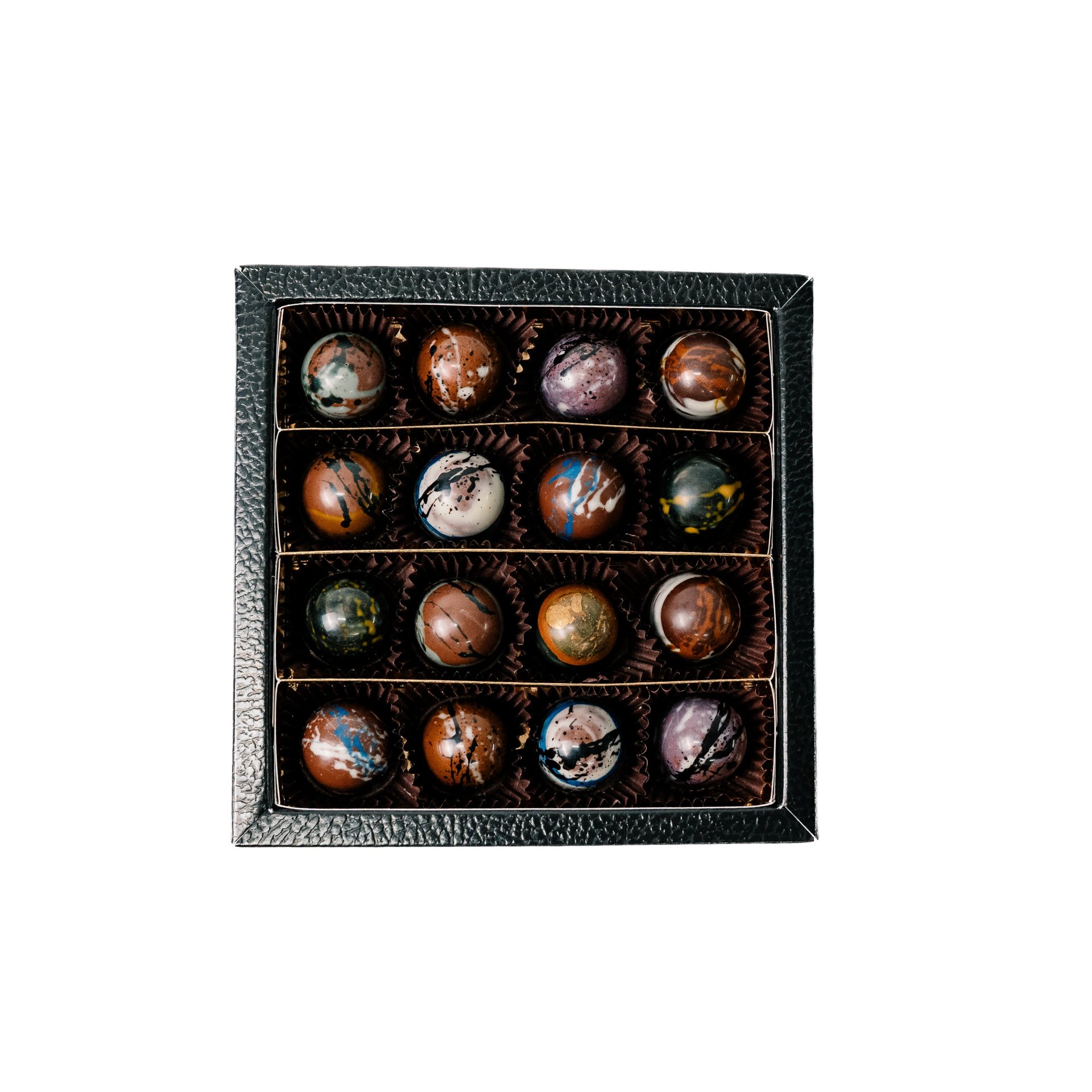 V mléčné čokoládě: 2x pistáciová, 2x s vlašský ořech, 2x tmavý nugát, 1x arašídová se slaným karamelem, 2x lískooříšková, 2x kokosová s rumem Dos Maderas, 2x pekanová s hruškovým pyré