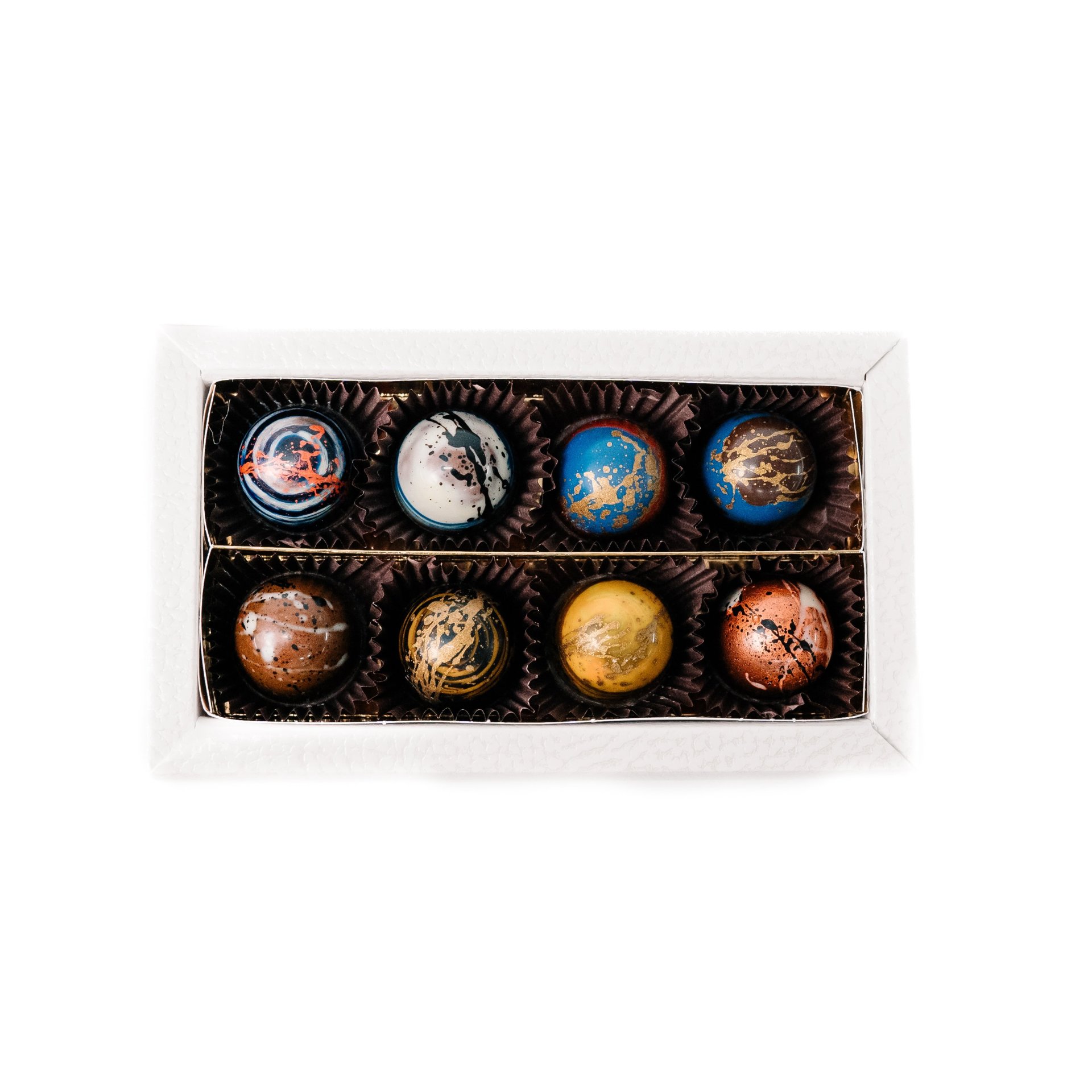 Výběr čokoládových pralinek z hořké a mléčné čokolády.
