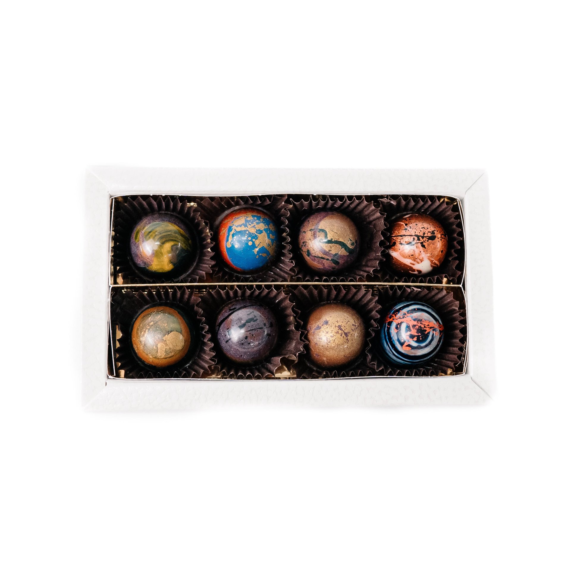 Výběr čokoládových pralinek z hořké a mléčné belgické čokolády.
