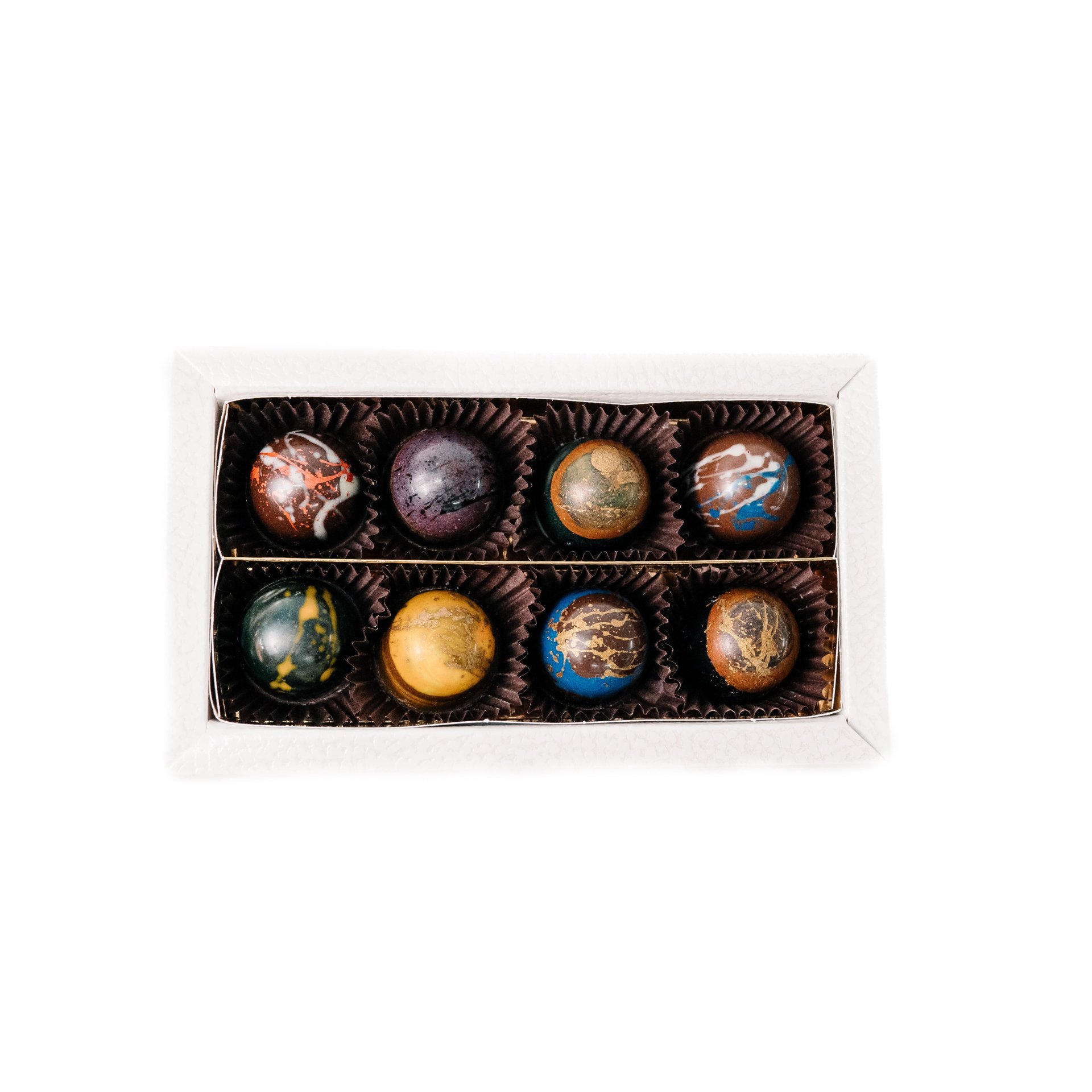 Výběr čokoládových pralinek z hořké a mléčné čokolády.