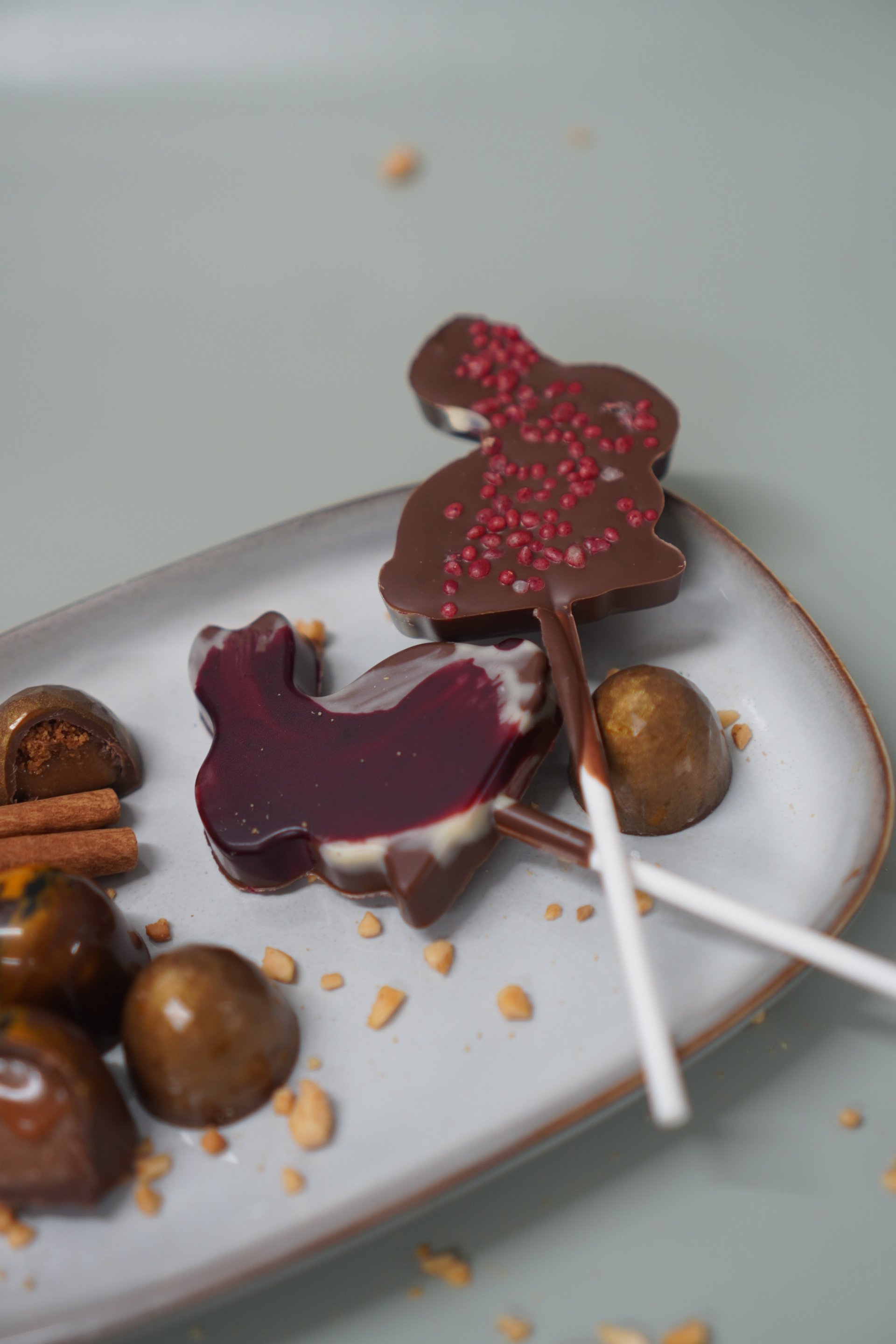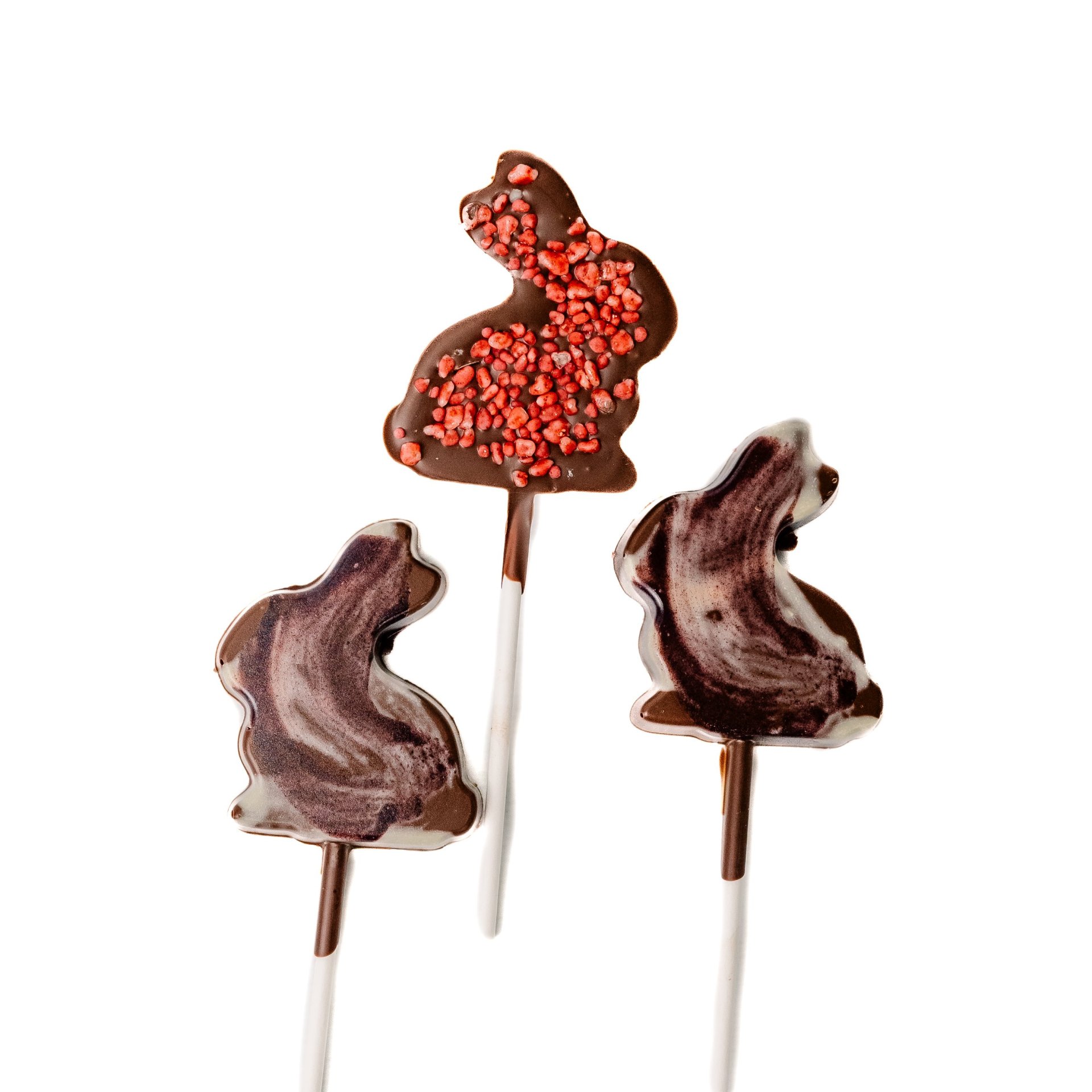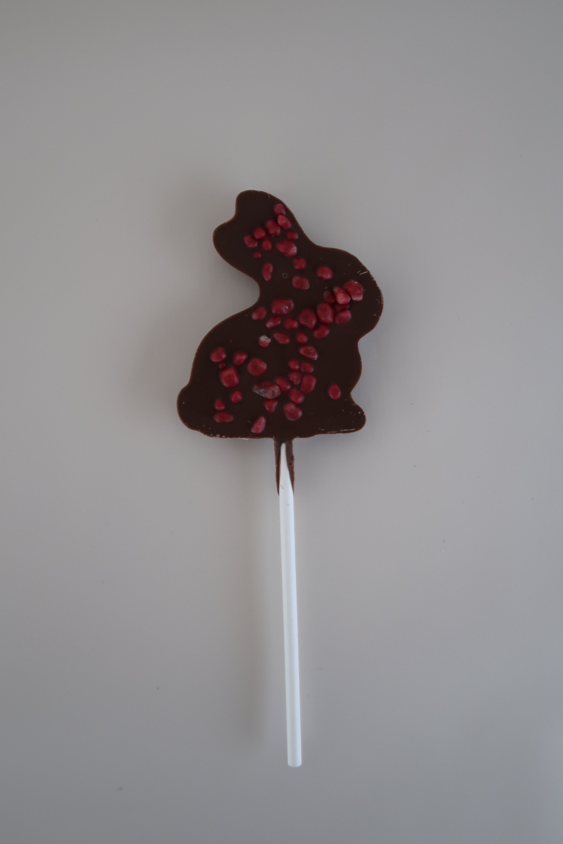 Čokoládové lízátko z mléčné belgické čokolády s malinovým posypem s "práskajícím" efektem. Tohoto zajíčka si oblíbí nejen Vaše děti.