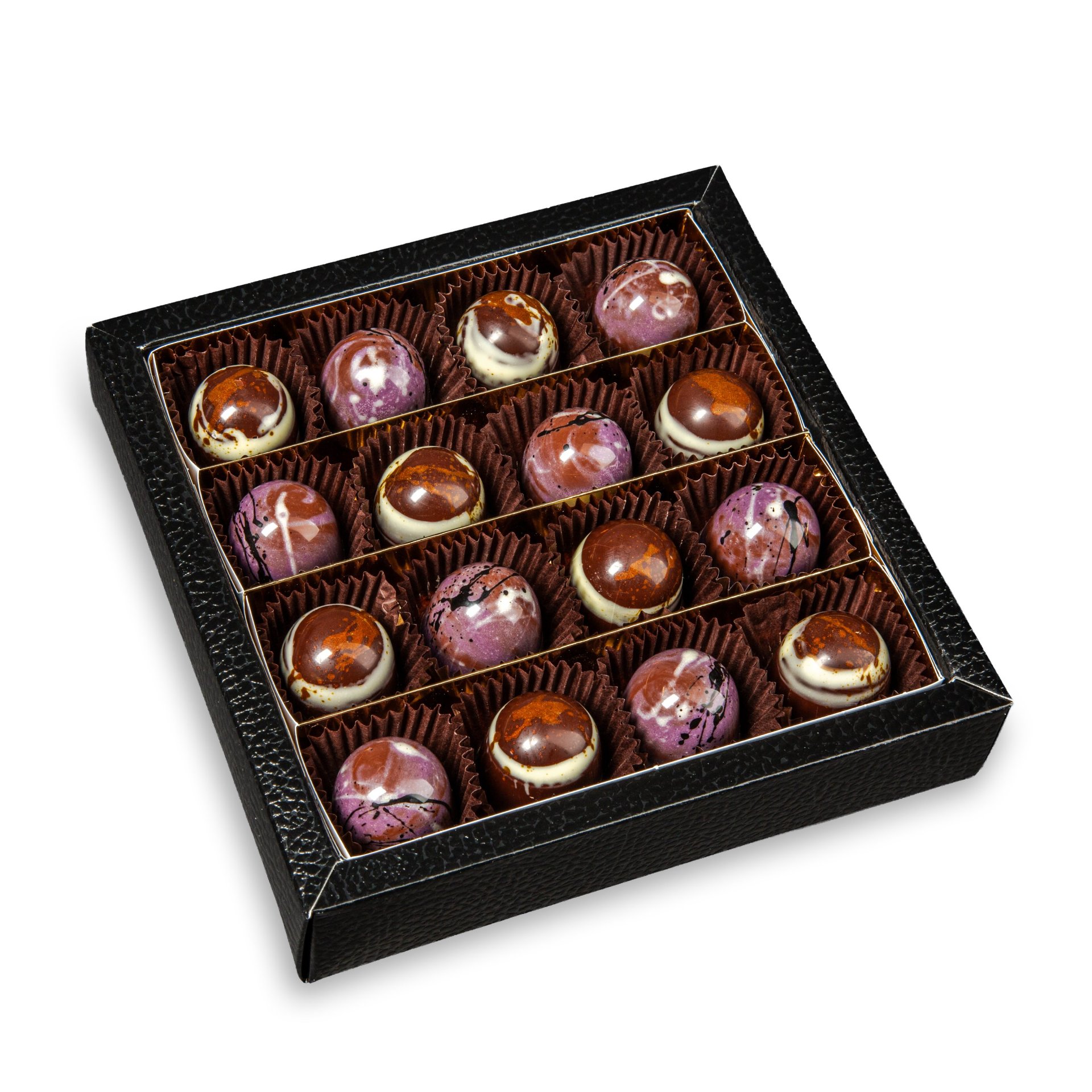 Výběr 16 pralinek s 8 kusy tmavého lískooříškového nugátu v mléčné čokoládě a 8 kusy světlého nugátu v hořké čokoládě. Harmonické spojení ořechové plnosti a čokoládové bohatosti nabízí vyváženou chuťovou rozmanitost.