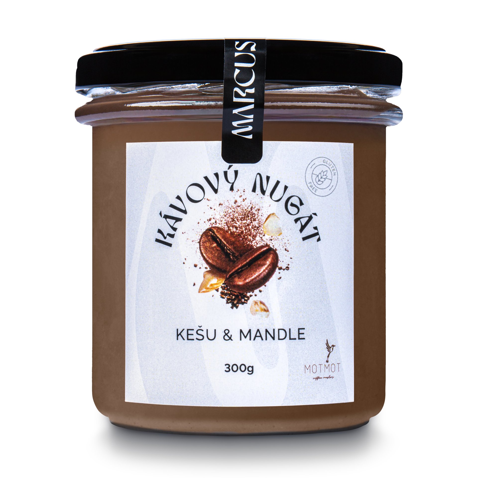 Složení: Pražené mandle natural 32 %, pražené kešu 32 %, belgická bílá čokoláda čokoláda 30 % (cukr, kakaové máslo, sušené plnotučné mléko, emulgátor: sójový lecithin, přírodní vanilkové aroma), výběrová káva Arabica (Marcus blend) z pražírny MOTMOT 6%.