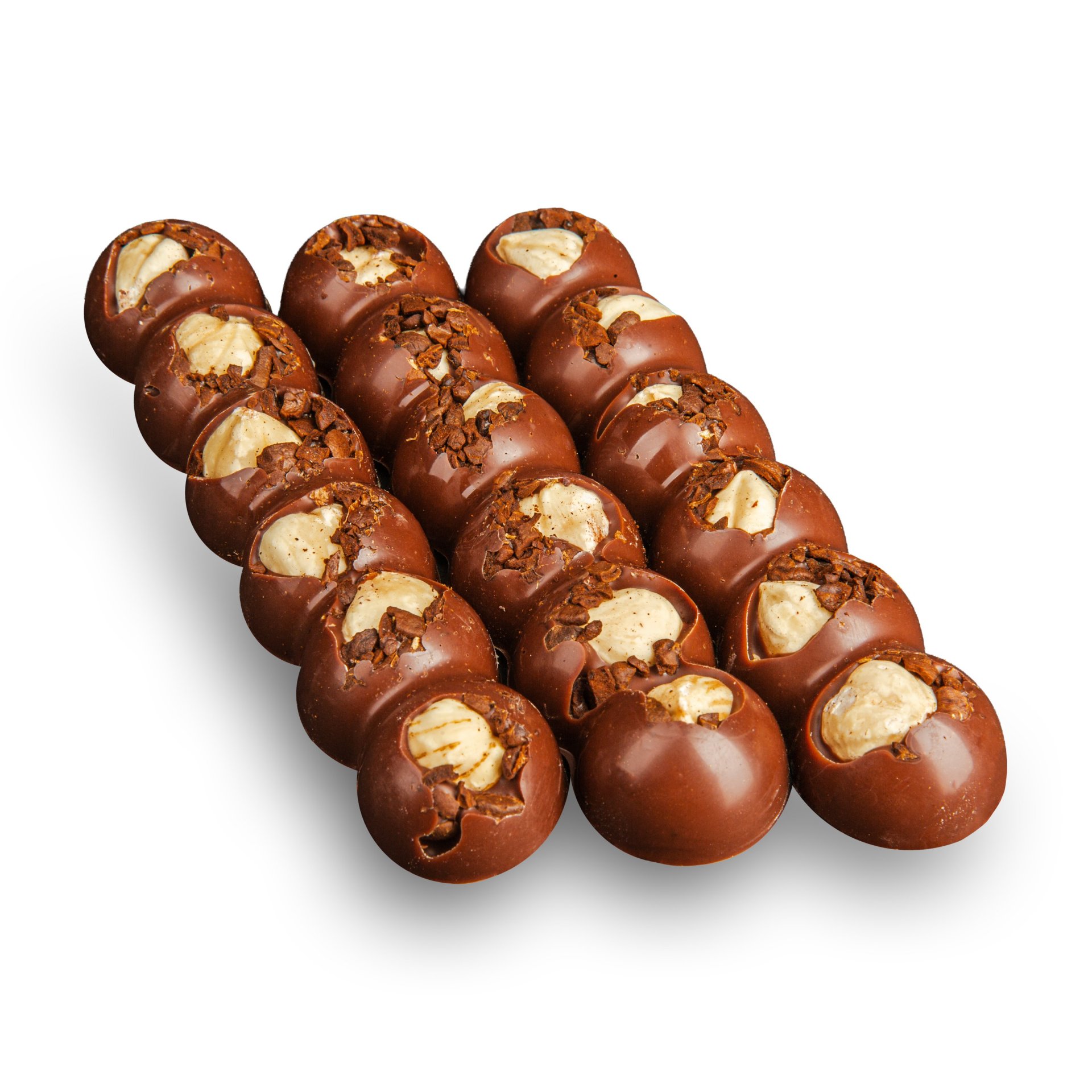 Křupnutí ořechu, intenzita kávy a hebkost čokolády vytváří harmonii chutí, která potěší při kávové pauze i jako malý, poctivý dárek.