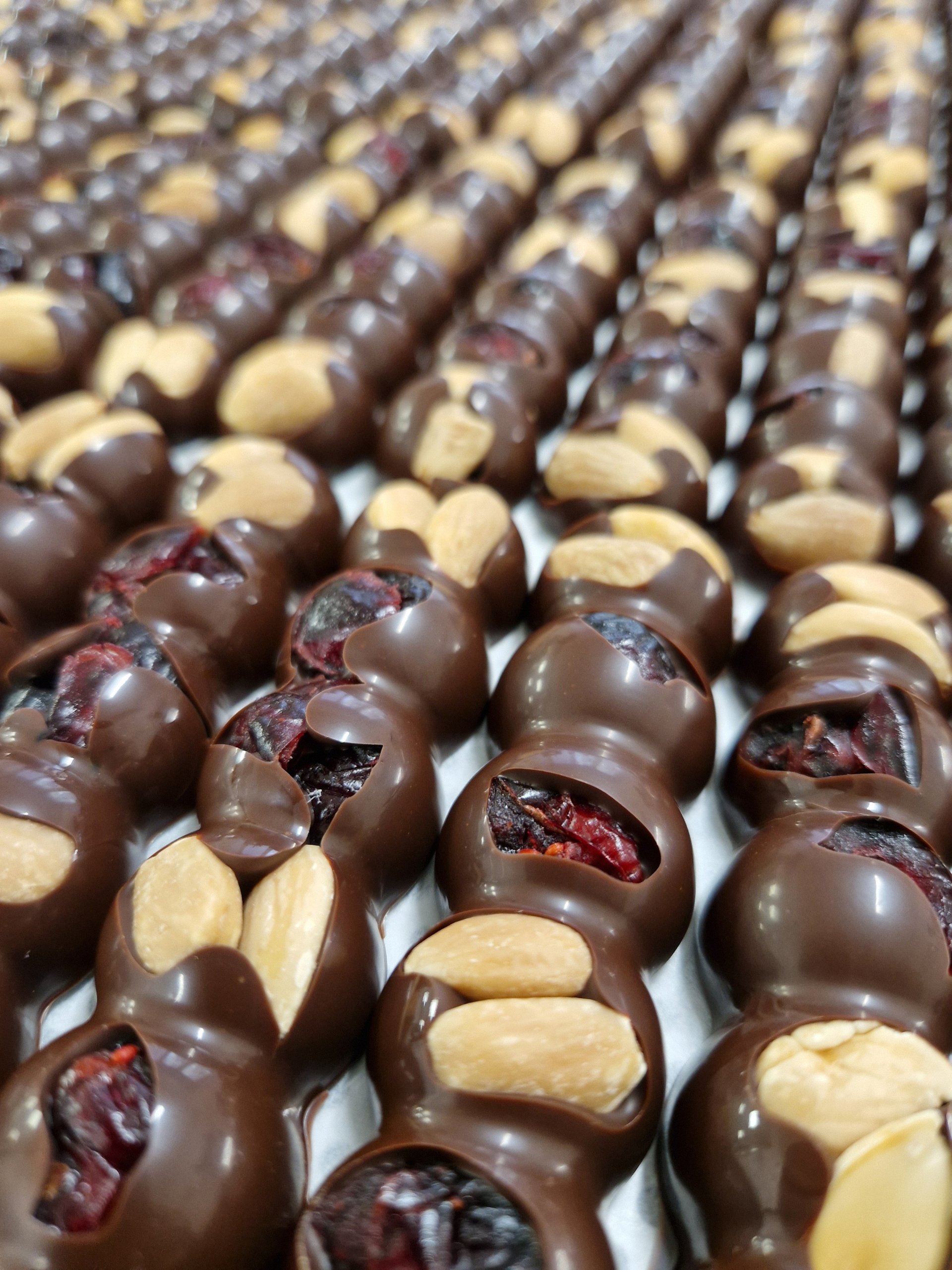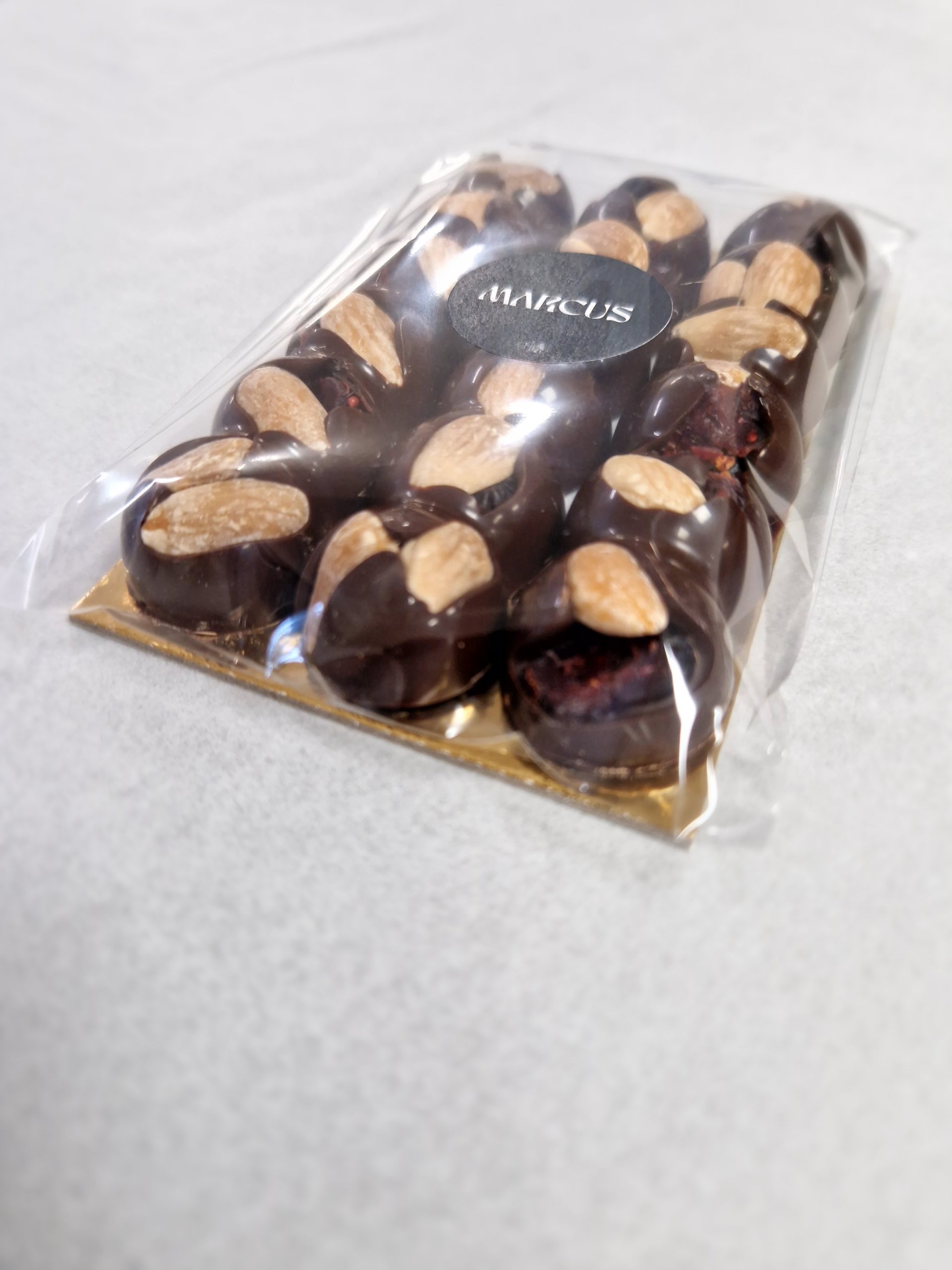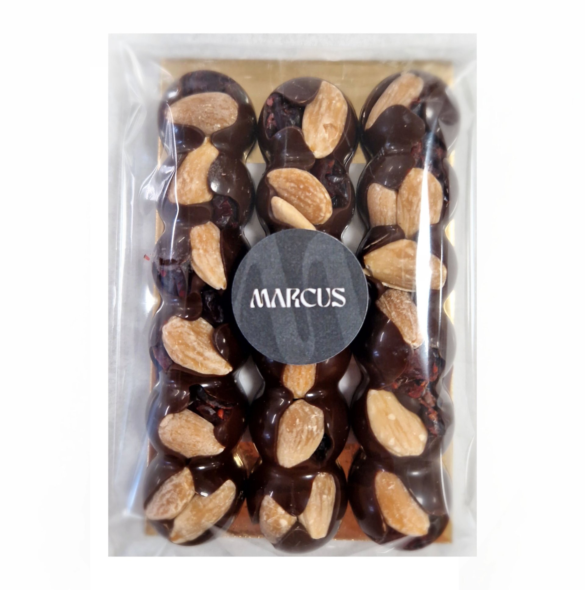 Složení: hořká belgická čokoláda 57,9% (kakaová hmota, cukr, kakaové máslo, emulgátor: sójový lecithin, přírodní vanilkové aroma), brusinky (brusinky 60%, cukr (39%), slunečnícový olej), pražené mandle