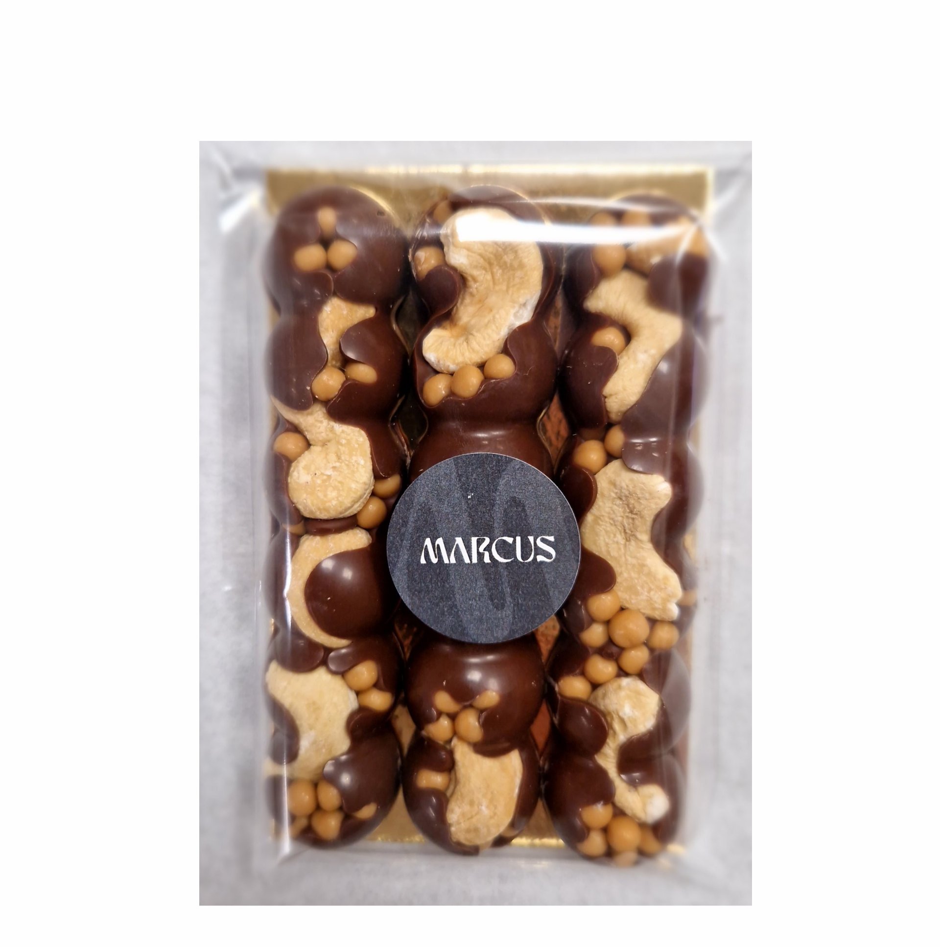 Pražené kešu ořechy v mléčné belgické čokoládě se sladko-slaným posypem kuliček ve slaném karamelu. 3 tyčinky v balení.
